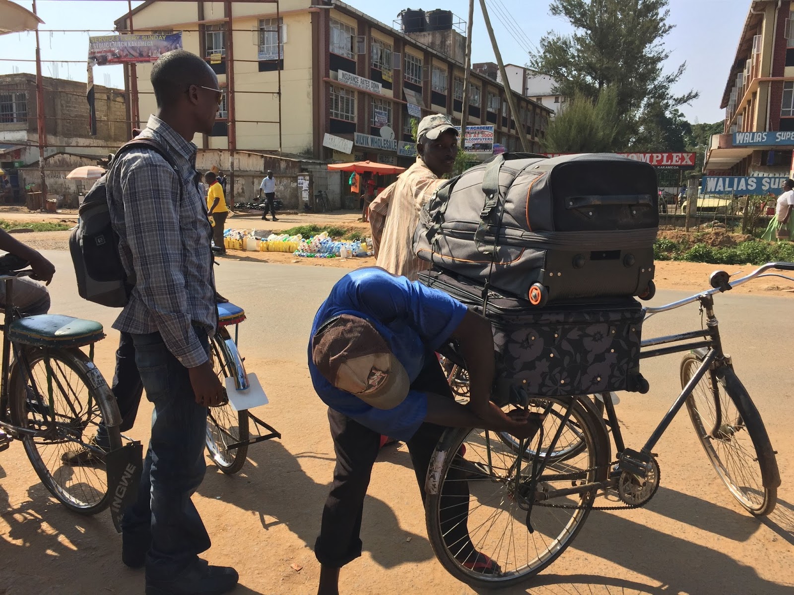 | Tying the luggage onto the back of a Bodaboda, bicycle taxi |